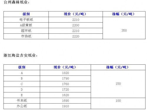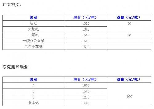 以包裝紙產量最大的兩個省廣東和浙江為例,從11月24號開始,主要大紙廠開始新一輪大幅提價,爭搶廢紙資源,其中部分產能較小、議價能力弱的企業為了搶原料,不得不開出更高的價格。部分企業情況如下: