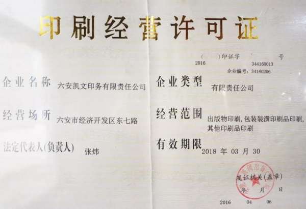 圖為六安凱文印務(wù)有限責(zé)任公司印刷經(jīng)營(yíng)許可證