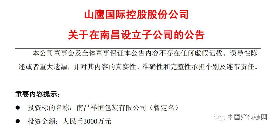 7月12日,山鷹國際控股股份公司發布公告,宣稱為完善地域布局,進一步滿足現有客戶群體的需求,其全資子公司祥恒創意包裝有限公司擬出資人民幣3000萬元設立南昌祥恒包裝有限公司。