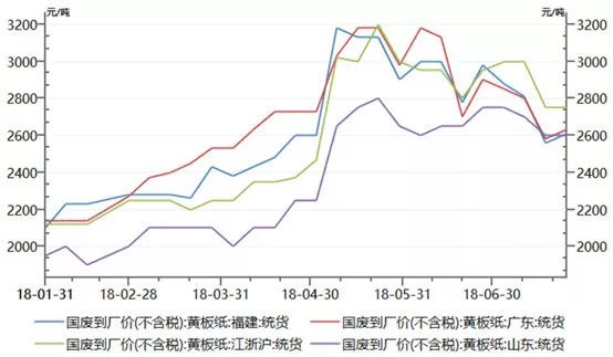 以瓦楞紙為例,該品種自今年5月份創(chuàng)下年內(nèi)新高后,價(jià)格開始回落,進(jìn)入7月份,瓦楞紙市場(chǎng)均價(jià)開始企穩(wěn),期間一度小幅反彈,目前維持在5148.33元/噸已有半月。而在廢紙系成本端,國(guó)廢價(jià)格也已經(jīng)開始反彈,福建、廣東地區(qū)黃板紙統(tǒng)貨價(jià)格上周單周漲幅50元/噸。