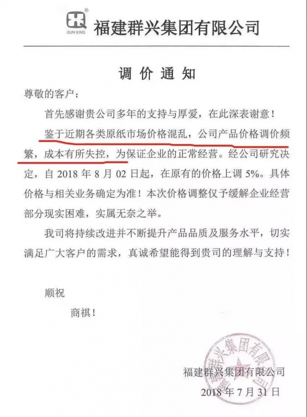 以福建群興集團(tuán)有限公司發(fā)布的調(diào)價(jià)通知為例,該公司表示,鑒于近期各類原紙市場(chǎng)價(jià)格混亂,公司產(chǎn)品價(jià)格調(diào)價(jià)頻繁,成本有所失控,研究決定自2018年8月2日起,在原有的價(jià)格上調(diào)5%。