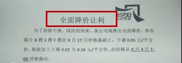 在需求縮減的經濟大環境下,下游紙板廠也只能有苦自己扛——降價!降價!降價!你沒有聽錯,9月3日浙江臺州松彩包裝股份有限公司就發出降價函,宣布從9月4日7:00開始,所有箱片B楞E楞F楞在8月17日價格基礎上下調0.05元/平方價,拖膠加工下降0.02為0.18元/平方價。
