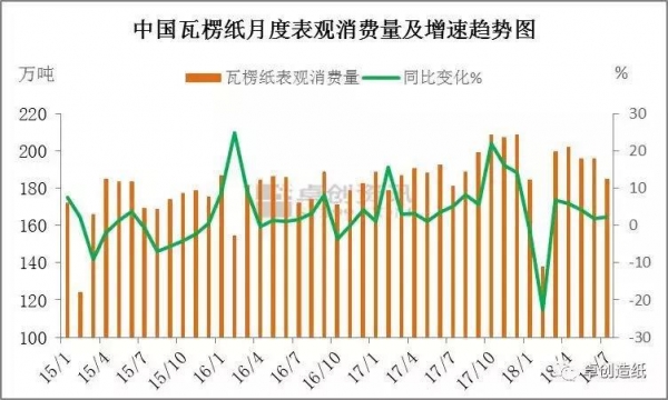 卓創分析,目前瓦楞紙市場供應壓力尚存,多數紙企庫存處于高位。下游需求一方面受國民經濟增速下滑影響,終端消費積極性不高,包裝用紙消耗有限;另一方面出口訂單下滑,間接影響瓦楞紙需求釋放。