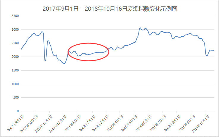 根據(jù)相關(guān)統(tǒng)計(jì)分析,今年整體廢紙的走勢相對(duì)于2017年來說提前了2-3個(gè)月,上半年主要因?yàn)橥鈴U供應(yīng)減量,紙廠搶購國廢,隨之廢紙價(jià)格一直高位運(yùn)行,而第三季度以來,則是因?yàn)槌善芳堜N量下滑,這對(duì)于廢紙來說體現(xiàn)在一定程度上對(duì)廢紙價(jià)格下跌風(fēng)險(xiǎn)的認(rèn)可。預(yù)測10月份之后的走勢會(huì)像往年一樣在指數(shù)大盤度過這道“千米”深淵之后迎來的是上圖中圈紅的“小跌小漲”波動(dòng)期。