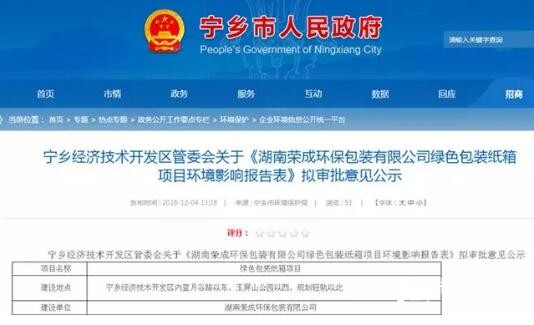 近期,湖南省寧鄉經濟技術開發區管委會公示了關于《湖南榮成環保包裝有限公司綠色包裝紙箱項目環境影響報告表》擬審批意見。