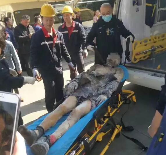 而在火災現場,一名男子被燒傷被抬出,其外衣被燒毀,頭面部燒傷較為嚴重。該男子被迅速送往人民醫院,經120送市第七人民醫院救治,診斷為大面積燒傷,所幸暫無生命危險。