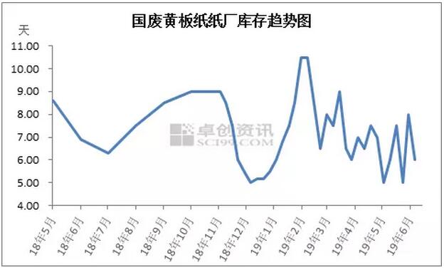 另一方面,紙廠廢紙庫存水平下降。2019年,即便是在外廢進口快速減量的背景下,紙廠常備廢紙庫存水平仍低于2018年。據卓創資訊監測數據顯示,2019年3-5月,紙廠廢紙庫存水平同比下降20.93%至6.80天。