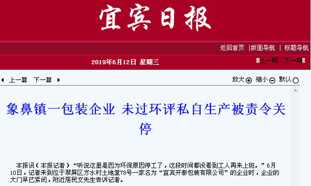 “聽(tīng)說(shuō)這里是因?yàn)榄h(huán)保原因停工了,這段時(shí)間都沒(méi)看到工人再來(lái)上班。”6月10日,宜賓日?qǐng)?bào)記者來(lái)到位于四川省宜賓市象鼻鎮(zhèn)翠屏區(qū)方水村土地堂78號(hào)一家名為“宜賓開(kāi)泰包裝有限公司”的企業(yè)時(shí),企業(yè)的大門(mén)早已緊閉,附近居民文先生告訴記者。