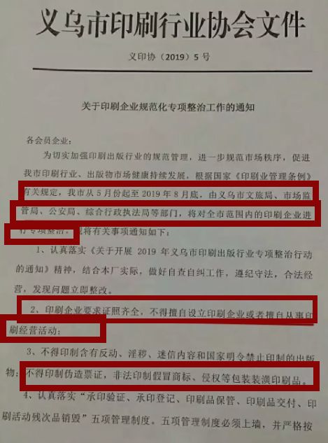 近日,浙江省義烏市印刷行業(yè)協(xié)會(huì)、義烏市新聞出版局、義烏市公安局、義烏市市場(chǎng)監(jiān)督管理局等多部門聯(lián)手發(fā)出紅頭文件:對(duì)當(dāng)?shù)赜∷⑵髽I(yè)進(jìn)行專項(xiàng)整治,主要查知識(shí)產(chǎn)權(quán)、非法經(jīng)營。