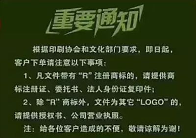 浙江義烏市政府相關(guān)負(fù)責(zé)人提醒:各印刷廠負(fù)責(zé)人應(yīng)增強(qiáng)責(zé)任感,守牢法律底線,嚴(yán)格按照印刷行業(yè)五項(xiàng)制度開展工作。今后在承印所有包裝裝潢印刷品時(shí),必須要對(duì)方提供商標(biāo)注冊(cè)證、委托書、營業(yè)執(zhí)照復(fù)印件等,個(gè)人的話需要委托書及身份證復(fù)印件等。并妥善留存驗(yàn)證的各種證明文件2年,以備出版行政部門、公安部門查驗(yàn)。