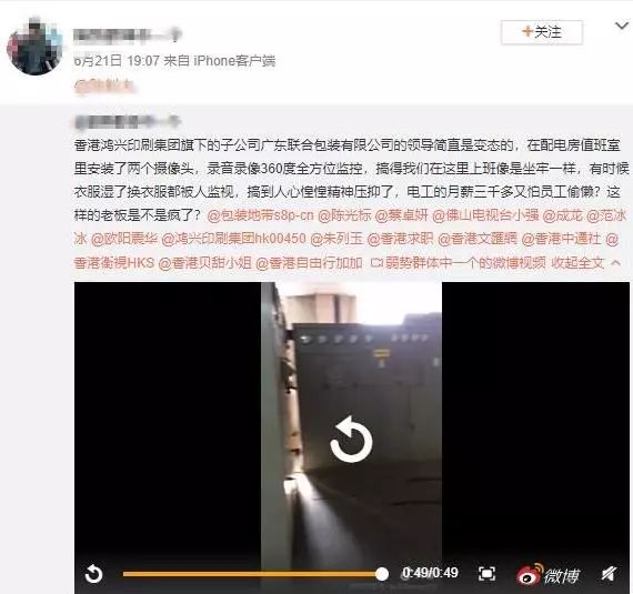 今日,包裝地帶微博收到一條微博視頻@消息,視頻里是廣東某知名外資包裝公司的電工發出的。視頻顯示,該企業的配電房與電工值班室安裝了兩個攝像頭。員工們表示:錄音錄像360度全方位監控,搞得我們在這里上班像是坐牢一樣,有時候衣服濕了換衣服都被人監視,搞到人心惶惶精神壓抑了。然而在如此壓抑的被監控氛圍下,電工的月薪僅三千多。