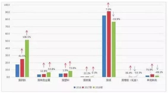 從2018年回收數據分析,廢紙回收量最大,回收量達76.8萬噸,占比53%,其次是廢鋼鐵,回收量為51.6萬噸,占比35%,廢塑料、廢玻璃、廢橡膠、其他種類回收量分別為8.6萬噸、0.8萬噸、0.2萬噸、2萬噸。、