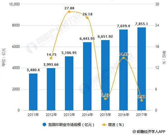 市場規模方面,目前,印刷業已成為國民經濟的重要組成部分之一。據前瞻產業研究院發布的《中國印刷業市場前瞻與投資戰略規劃分析報告》統計數據顯示,2011-2017年,我國印刷業市場規??焖僭鲩L,多個年份增速在10%以上。2011年我國印刷業市場規模已達3480.4億元,2013年我國印刷業市場規模突破5000億元,截止至2017年我國印刷業市場規模增長至7855.10億元,同比增長2.82%。
