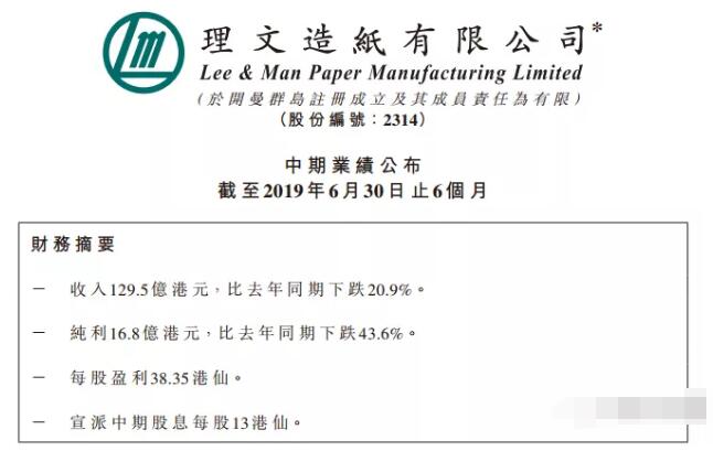 2019年上半年,造紙行業(yè)出現(xiàn)供大于求的現(xiàn)象,理文造紙銷售量及利潤均有所下降。截至2019年6月30日止6個(gè)月,總銷售量為281萬噸,產(chǎn)品平均每噸凈利潤為597港元;總收入同比下跌20.9%至129.47億港元,凈利潤下跌43.6%至16.80億港元。