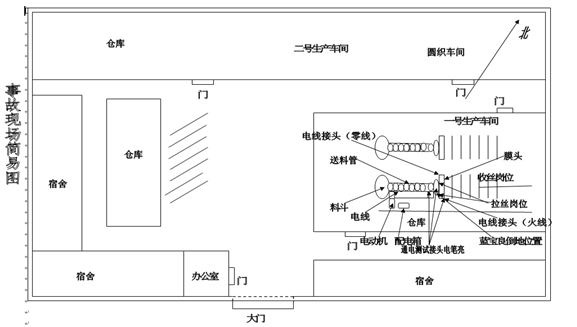 1.一號生產車間現狀。一號生產車間監控攝像設備損壞,內通風不良,光照不足,未按要求設置安全警示標志。拉絲機2臺間隔約3米由西向東并列布置在車間西北側,工種崗位依次為拌料、拉絲機頭、掛絲、送線、收線。南側為存放原料、半成品臨時倉庫。