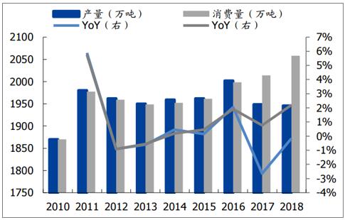 2006-2018年中國包裝紙消費量和產量數據走勢圖(單位:萬噸)