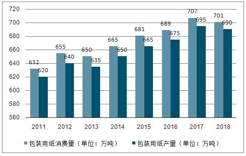 2018年包裝用紙生產量690萬噸,較上年增長-0.72%;消費量701萬噸,較上年增長-0.85%。2009~2018年生產量年均增長率2.05%,消費量年均增長率1.99%。
