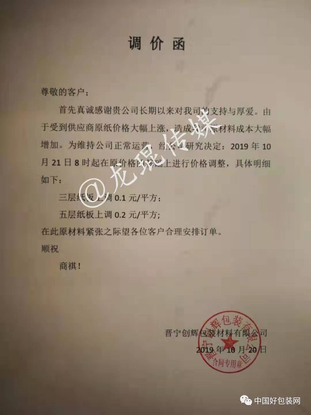 自10月21日8點起,三層紙板上調0.1元/平方米,五層紙板上調0.2元/平方米。