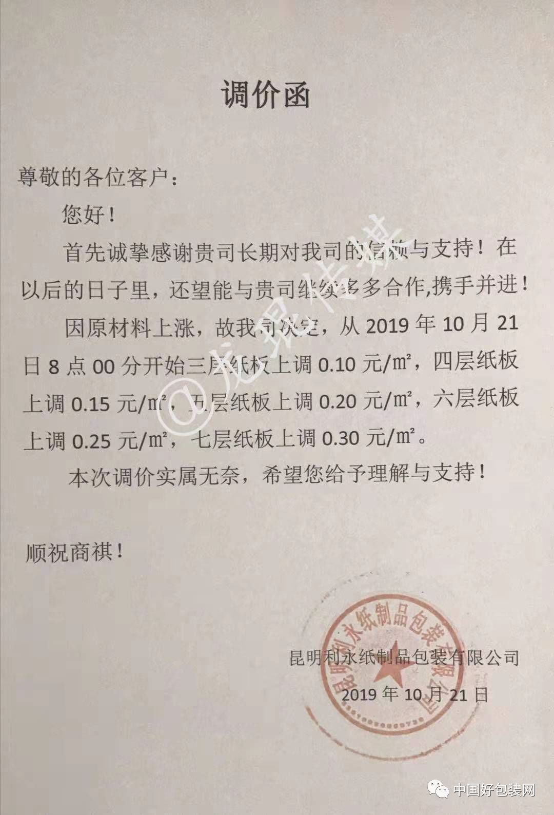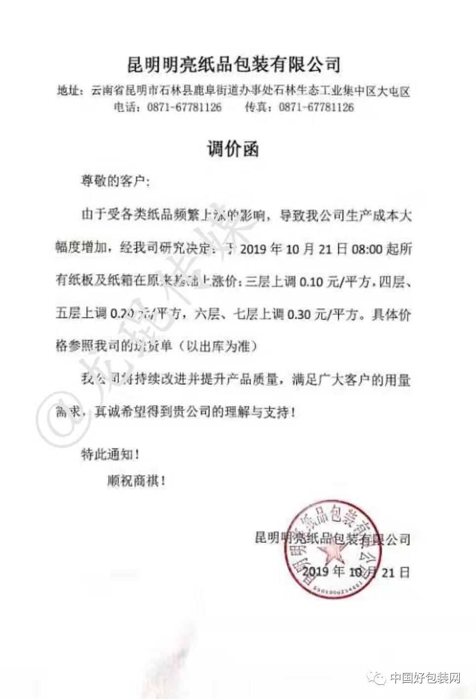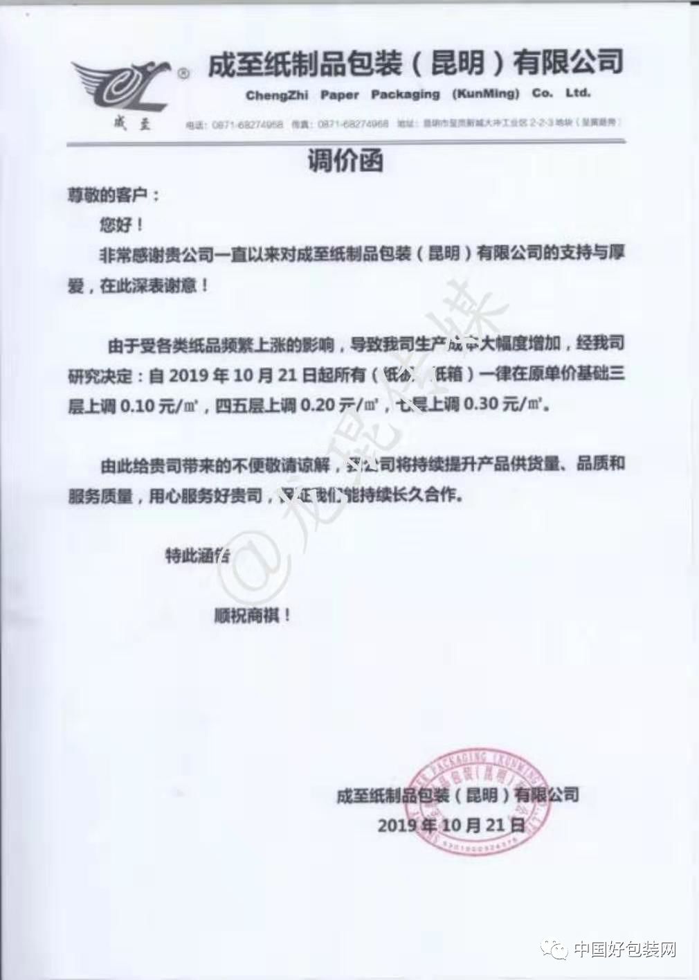 自10月21日起,三層紙板在原價格基礎上每平方上調0.1元,五層上調0.2元,七層上調0.3元,兩層上調0.08元。