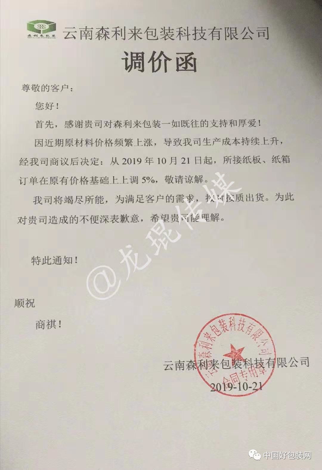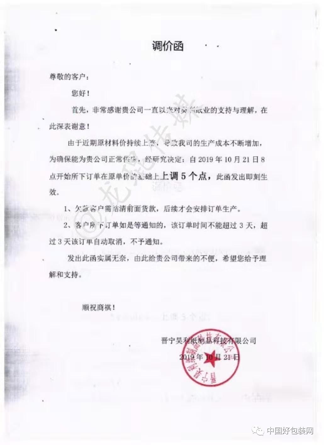 自10月21日起,所接紙板、紙箱訂單在原有價格基礎上上調5%。