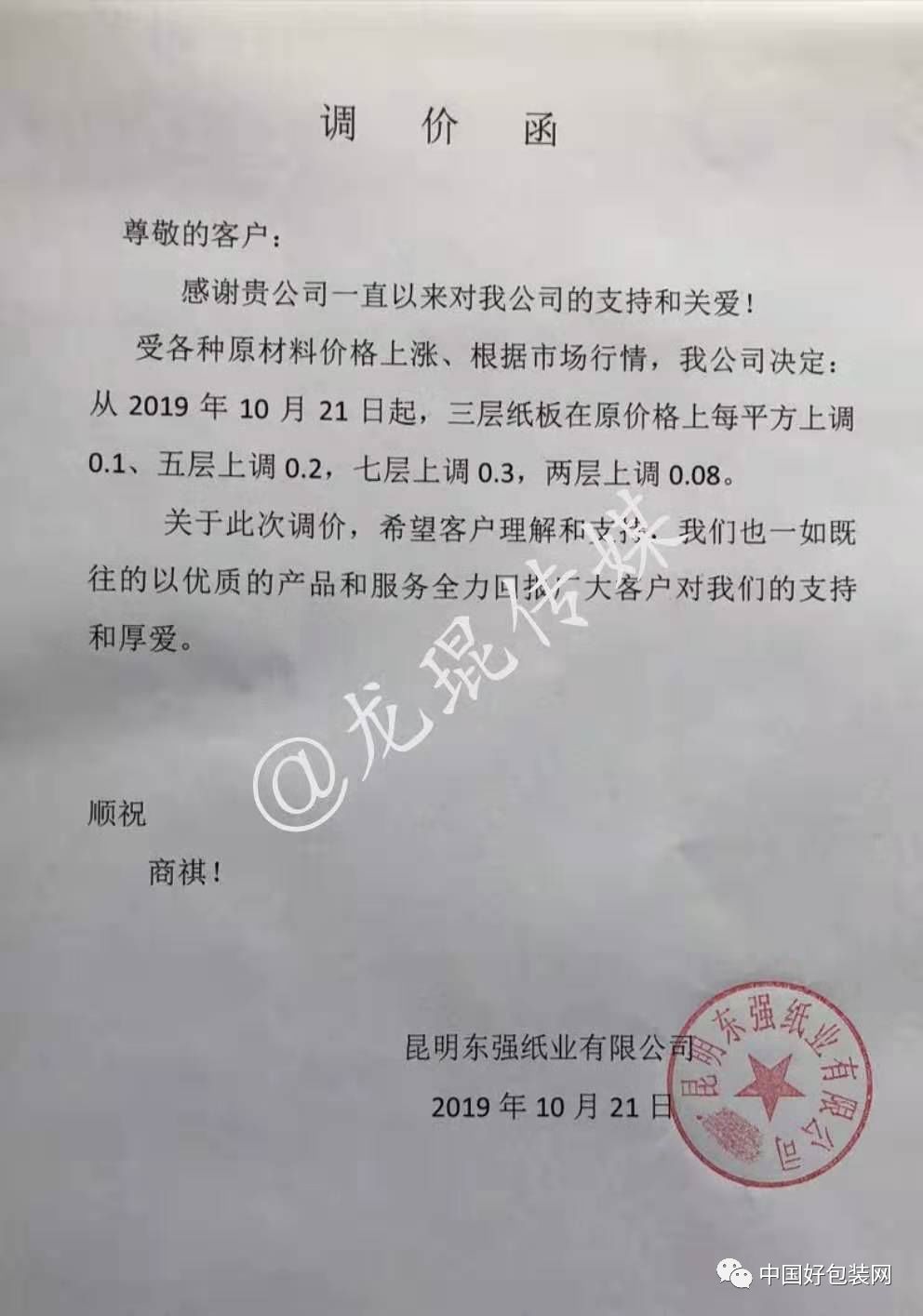 自10月21日起,所有紙板、紙箱在原單價基礎上,三層上調0.10元/平方米,四、五層上調0.20元/平方米,七層上調0.30元/平方米。