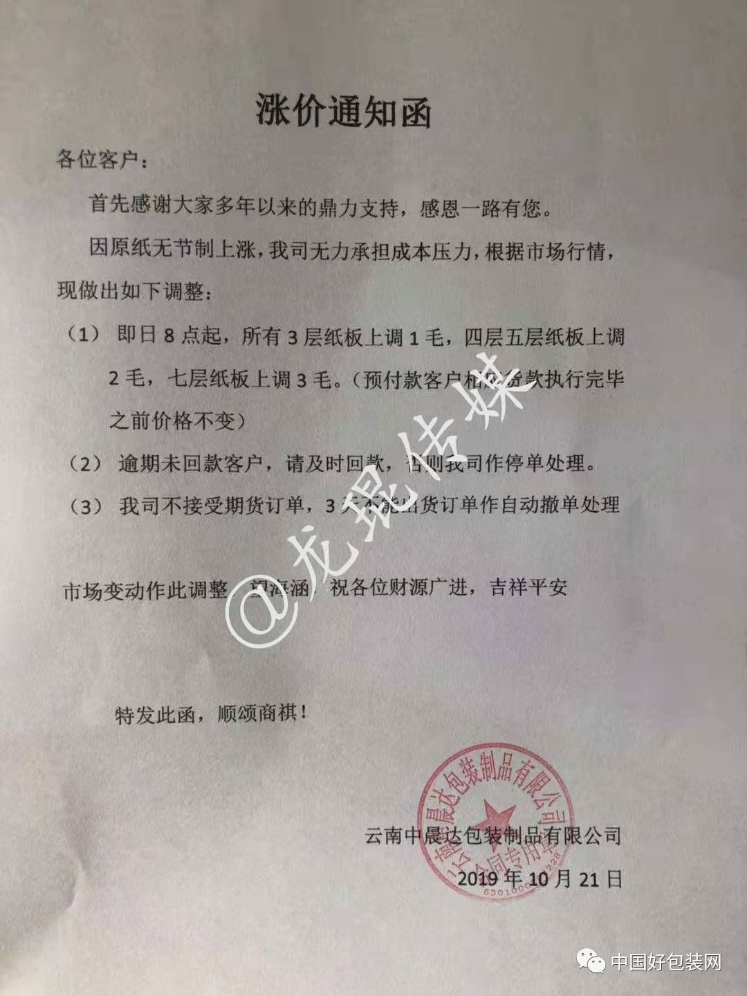 自10月21日8點起,所有三層紙板上調1毛,四層五層紙板上調2毛,七層紙板上調3毛(預付款客戶和相應貨款執行完畢之前價格不變)。逾期未回款客戶,請及時回款,否則作停單處理。3天不能出貨的訂單作自動撤單處理。