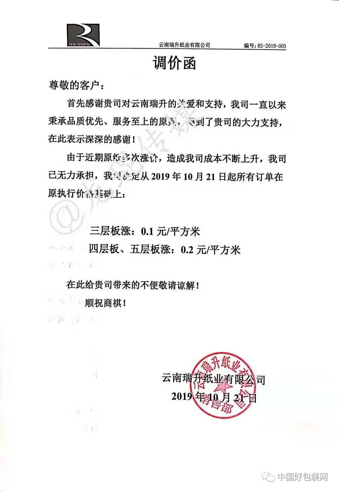 自10月21日起,三層紙板上漲0.1元/平方米,四層板、五層板上漲0.2元/平方米。