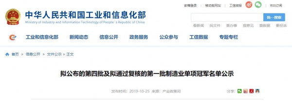 近日,根據《工業和信息化部辦公廳 中國工業經濟聯合會關于組織推薦第四批制造業單項冠軍和復核第一批制造業單項冠軍的通知》(工信廳聯產業函〔2019〕78號)要求,現將擬公布的第四批及擬通過復核的第一批制造業單項冠軍名單予以公示。