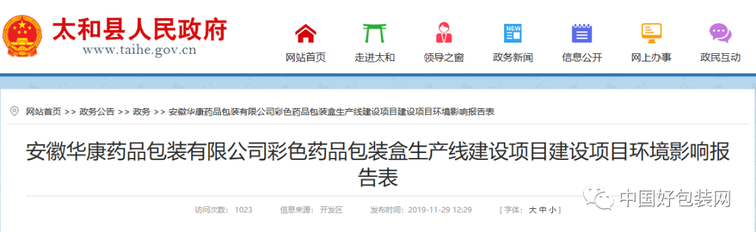 11月29日,安徽省阜陽市太和縣人民政府公示了“安徽華康藥品包裝有限公司彩色藥品包裝盒生產線建設項目環境影響報告表”。項目總投資6221.41萬元,建成后將年產5000噸彩色藥品包裝盒。