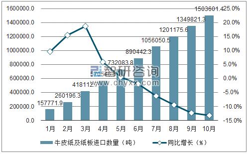 2019年1-10月中國牛皮紙及紙板累計進(jìn)口數(shù)量及增速趨勢圖
