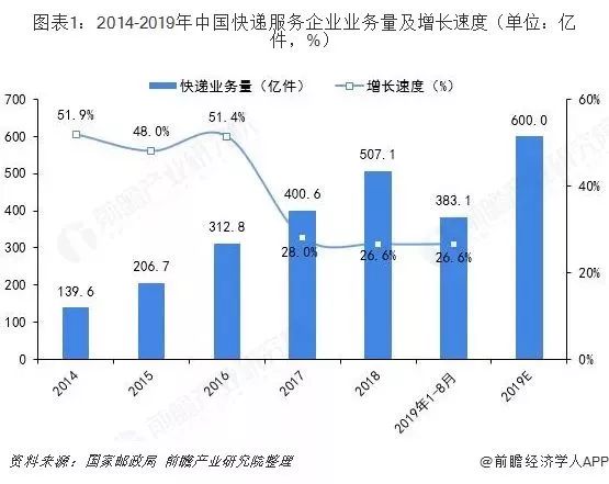 由數據可見,2017年中國快遞業務量突破400億件;2018年中國快遞業務量突破500億件;2019年快遞業務量又突破600億件。據快遞業“十三五”發展指標, 2020年我國的快遞量將有望達到750億件, 人均快件從2000年的0.01件 增長到2020年的約50件。