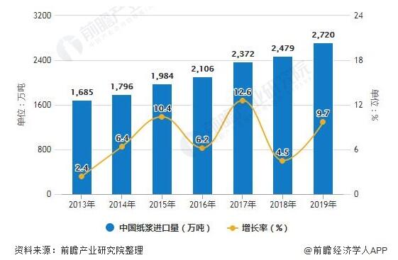 據中國海關總署統計數據顯示,2018年中國紙漿進口數達到了2479萬噸,累計增長4.5%。截止至2019年12月中國紙漿進口量為218萬噸,同比增長23.2 %。累計方面,2019年1-12月中國紙漿進口量達到2720萬噸,累計增長9.7%。