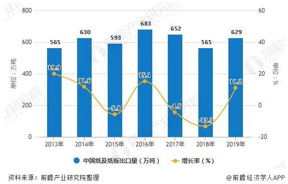2013-2019年中國紙及紙板出口量統計及增長情況