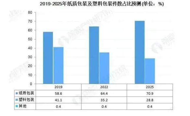 相對于2019年(按占比測算),受禁塑令影響將導致2025年紙質包裝快遞潛在需求增加165.9億件,采用可降解塑料的塑料包裝快遞潛在需求增加388.5億件(2019年國內塑料包裝快遞中采用可降解塑料比重遠低于1%,忽略不計)。