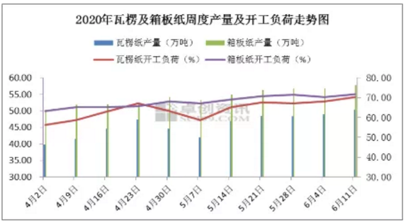 箱板紙方面,6月第二周較4月第一周開工負荷增加8.53%,且5月月度開工負荷率較4月增加3.48%。