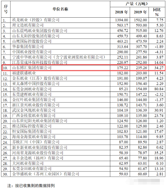 眾所周知,國(guó)內(nèi)白卡紙行業(yè)集中度極高,金光紙業(yè)、博匯紙業(yè)、晨鳴紙業(yè)、太陽紙業(yè)四家紙企均擁有百萬噸以上的年產(chǎn)能。其中,博匯紙業(yè)四臺(tái)白卡紙機(jī)最大年產(chǎn)能達(dá)290萬噸,2019年以235.26萬噸產(chǎn)量排名造紙企業(yè)前30強(qiáng)榜單的第十位。