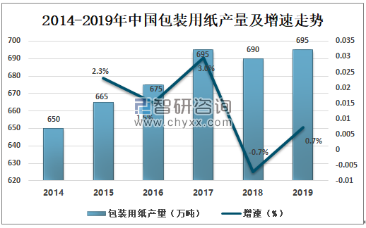 2014-2019年中國包裝用紙產(chǎn)量及增速走勢