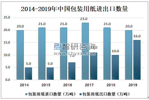 包裝用紙對應(yīng)的下游是消費品,后者的增速直接影響也裝紙的需求。商品出口快速增加促使包裝需求猛增,同包裝附紙領(lǐng)域里,不論是白紙板還是箱扳楞紙,現(xiàn)飛速發(fā)展?fàn)顟B(tài)。包裝用紙進(jìn)口數(shù)量大于出口數(shù)量,2018年中國包裝紙進(jìn)口數(shù)量為21萬噸,出口數(shù)量為10萬噸,相差11萬噸。2019年中國包裝紙進(jìn)出口只相差4萬噸。