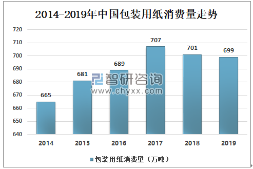 然而最近的幾年里,中國消費品出口增速下降,甚至有部分產(chǎn)品的產(chǎn)地從中國轉(zhuǎn)移到了其他新興市場,導(dǎo)致相應(yīng)的出口商品包裝用紙需求增速放緩。從2017年包裝紙消費量的707萬噸開始下降到2019年包裝用紙消費量699萬噸。