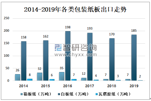 由于受到環(huán)保持續(xù)趨嚴(yán)、原料供給受限等因素影響,箱紙板和瓦楞原紙進(jìn)口量大幅增長,使國內(nèi)箱紙板和瓦楞原紙市場競爭更加激烈。隨著我國包裝紙板企業(yè)海外項目建成投產(chǎn),進(jìn)口包裝紙板的總量將繼續(xù)增長。2019年箱板紙進(jìn)口數(shù)量為220萬噸;白板紙進(jìn)口數(shù)量為52萬噸,瓦楞原紙進(jìn)口數(shù)量為156萬噸。