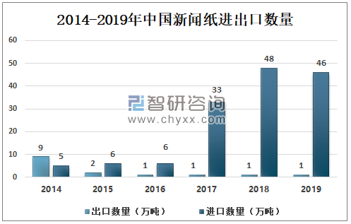 2014-2019年中國新聞紙進出口數量