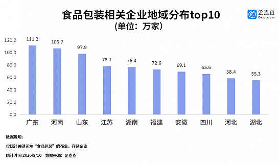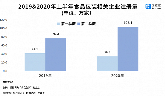 2020年上半年,我國食品包裝相關(guān)的企業(yè)注冊量為137.2萬家,同比增長16.3%。其中,二季度注冊量達(dá)到103.1萬,環(huán)比上漲202.4%。