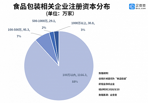 從企業(yè)注冊資本分布來看,企查查數(shù)據(jù)顯示,我國食品包裝相關(guān)的企業(yè)注冊資本分布在100萬以內(nèi)的企業(yè)數(shù)量最多,占比88%,500萬元-1000萬元的占比2%,1000萬元以上的占比3%。
