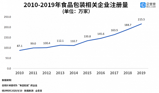 近年來,隨著食品餐飲行業(yè)的發(fā)展,食品包裝和食品包裝紙市場持續(xù)擴(kuò)大。2019年,食品包裝相關(guān)企業(yè)的注冊量為215.5萬,同比增長14.2%。而2010年,相關(guān)企業(yè)注冊量為87.1萬家,10年間年注冊量增長1.5倍。