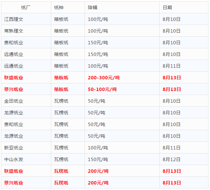 因此,在進入本周以后部分小紙廠開始“搶跑”,搶先開啟了降價模式。截至8月12日,已有山東貴和、遠通紙業、中山永發、東莞金洲等7家紙廠完成了第一步調價。