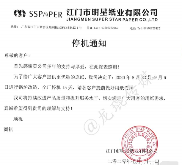 今年7月底,江門市明星紙業(yè)發(fā)布停機通知稱,決定于8月23日-9月6日進行鍋爐改造,全廠停機15天。據(jù)“江門檢察”報道,今年由于疫情影響,該紙廠資金周轉(zhuǎn)存在困難,已先后兩次被迫停機停產(chǎn),累計時長達40多天。