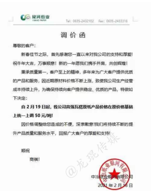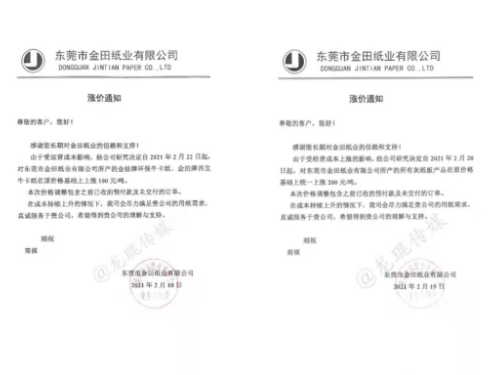 從2021年2月20日起,所有灰紙板產(chǎn)品在原價格基礎(chǔ)上統(tǒng)一上漲200元/噸,金娃牌環(huán)保牛卡紙、金泊牌再生牛卡紙在原價格基礎(chǔ)上上漲100元/噸。