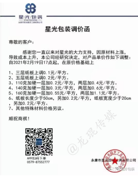 自2月19日17點開始,三層紙板上漲0.1元/平方,四層、五層上漲0.2元/平方,七層上漲0.3元/平方。加硬一層110克加0.2元/平方,加硬一層130克加0.3元/平方,加硬一層160克加0.6元/平方。