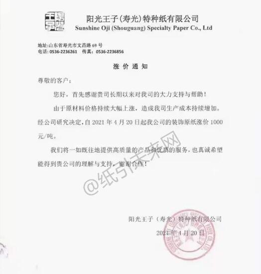 陽(yáng)光王子(壽光)特種紙有限公司:由于原材料價(jià)格持續(xù)大幅上漲,造成我司生產(chǎn)成本持續(xù)增加? 經(jīng)公司研究決定,自2021年4月20日起我公司的裝飾原紙漲價(jià)1000元/噸。