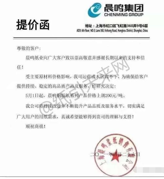 晨鳴集團(tuán):受主要原材料價(jià)格影響,我司運(yùn)營(yíng)成本居高不下,為確保給客戶提供持續(xù)、穩(wěn)定的高品質(zhì)產(chǎn)品及服務(wù),經(jīng)研究決定∶? 5月1日起,晨鳴銅版紙系列產(chǎn)品價(jià)格上調(diào)200元/噸。